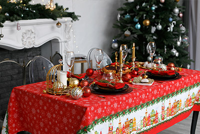 Постелите скатерть, расставьте посуду и разложите приборы согласно количеству ожидаемых гостей. Если вы подготовили дополнительный декор — столовые дорожки, салфетки, цветочные или ёлочные композиции — самое время разместить их на праздничном столе. Делать это в торжественном платье, с причёской и макияжем будет неудобно.
