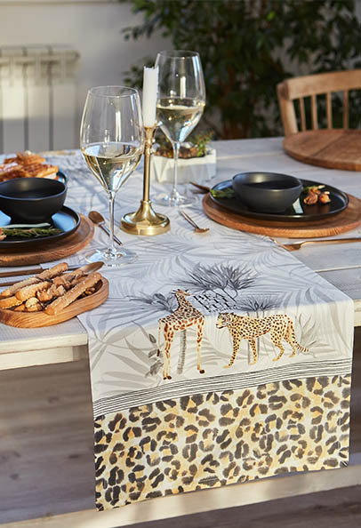Леопардовый принт добрался и до кухонного текстиля. Теперь он нашёл своё место на дорожках, скатертях, прихватках, фартуках и не только. Изделия серии выполнены из саржи — плотной износостойкой ткани с роскошной фактурой.