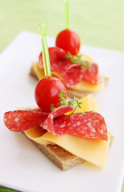 На каждый кусочек хлеба положите скрученный сыр, затем салями. Закрепите канапе шпажками с нанизанными помидорами черри.На каждый кусочек хлеба положите скрученный сыр