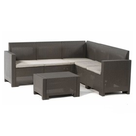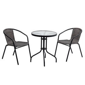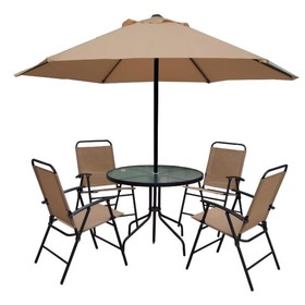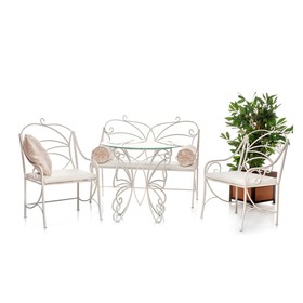 Этот вариант подойдёт для тех, у кого свободное пространство очень ограничено. Всё что нужно — столик и пара стульев, остальное по желанию. Если площадь позволяет, можно поставить широкий диван, добавить в композицию цветы и садовые фигуры.