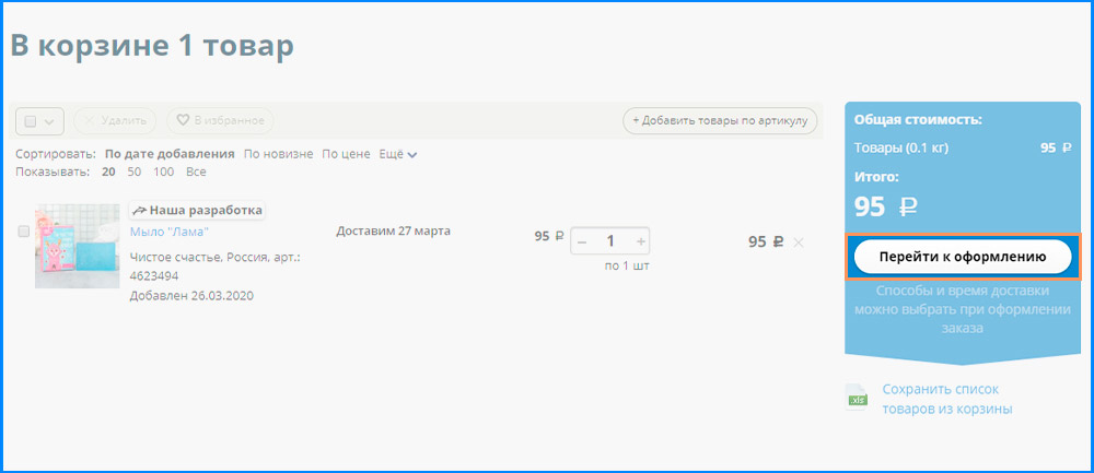 Шаг 2. Зайдите в корзину, проверьте список покупок. Не забудьте заглянуть в раздел с актуальными акциями. Нажмите кнопку «Перейти к оформлению».