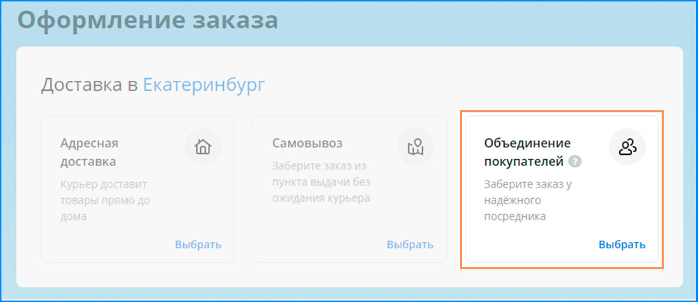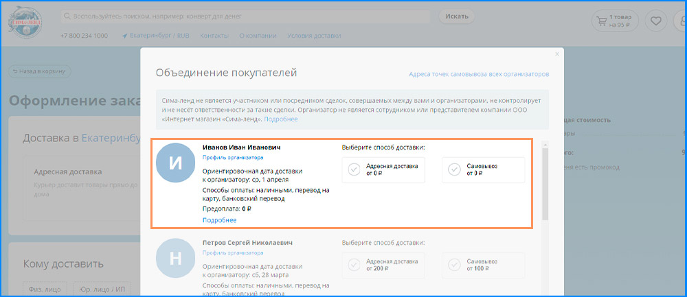 Шаг 3. Выберите способ доставки «Объединение покупателей» и организатора, чьи условия подходят вам по срокам и стоимости.