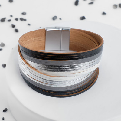 Носить массивные браслеты с металлическим оттенком можно как на открытой руке, так и поверх манжетов. Но во втором случае принт на ткани не должен конкурировать с украшением. Агрессивные аксессуары крупных размеров и так привлекают максимум внимания.