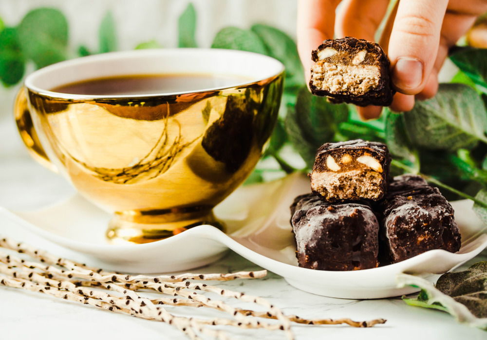 - Растопите оставшийся шоколад и разлейте сверху по формам. Уберите в холодильник. Когда батончики полностью застынут — их можно подавать.