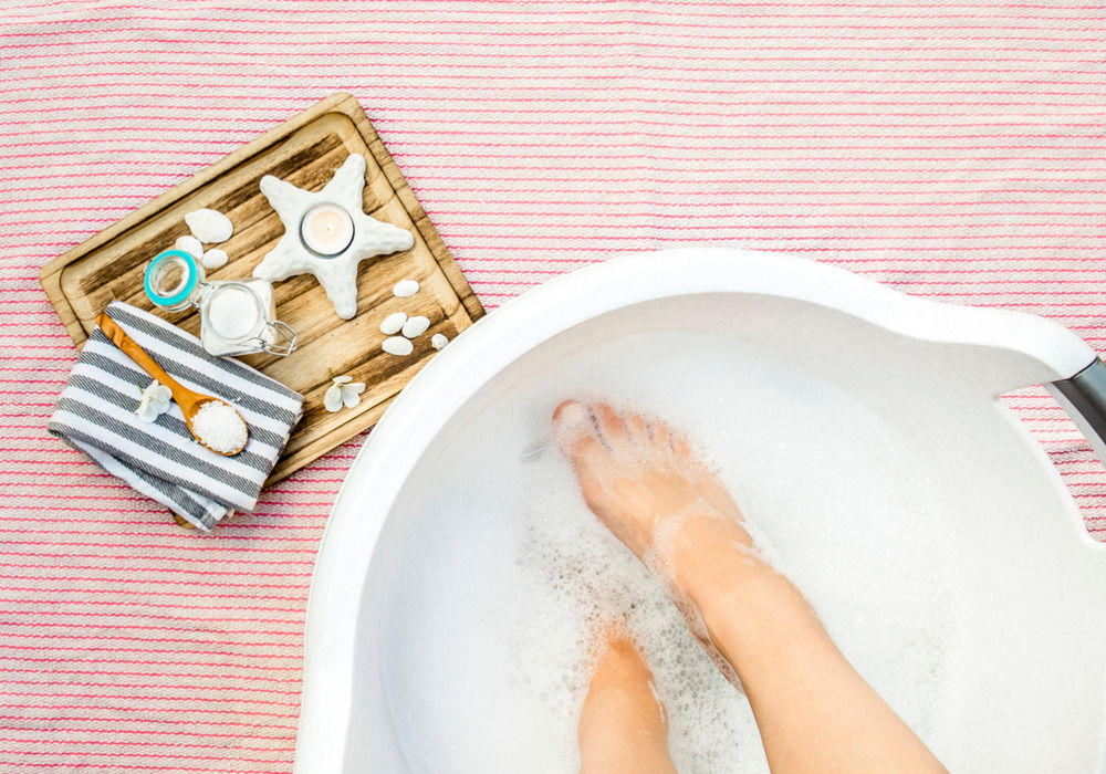 Сначала кожу необходимо очистить и распарить — так она станет податливой. Для этого наберите в ванночку или в таз горячей воды, чтобы ступни были полностью покрыты. Старайтесь использовать воду максимально высокой температуры, но не обжигающую — она должна быть приятной для ног.