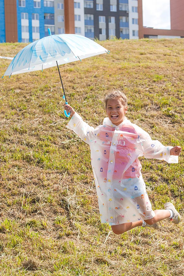 Лучше всего защитит от дождя зонт куполообразной формы. Под него не залетают капли сбоку, а значит, плечи останутся сухими. Такие модели должны быть с прозрачными областями, чтобы ребёнок видел, куда идёт.