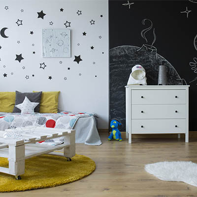 Детская, украшенная звёздами, точно не даст скучать вам и вашему малышу. Ведь здесь можно дать волю своей фантазии. Например, перед сном отправиться в космос! Сделать это можно с помощью тематического текстиля.