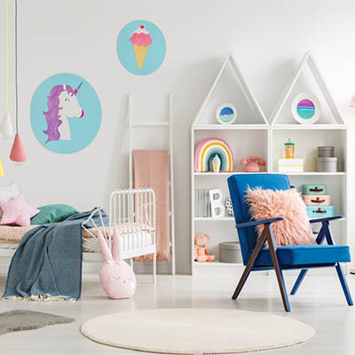 Позвольте ребёнку окунуться в волшебный мир сказок! Нежно-розовые шторы, единороги и подушки с героями мультфильмов точно исполнят мечты маленьких принцесс.