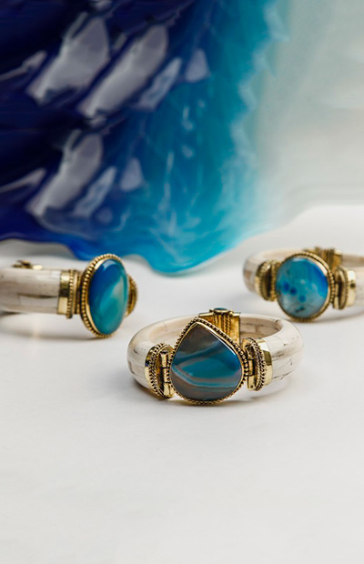 Вдохнуть в образ лёгкость и свежесть помогут аксессуары цвета морских пучин. Оттенки лазури, индиго и бирюзы, заключённые в изящные браслеты и серьги, будут напоминать шелест волн и переливы водной глади.
