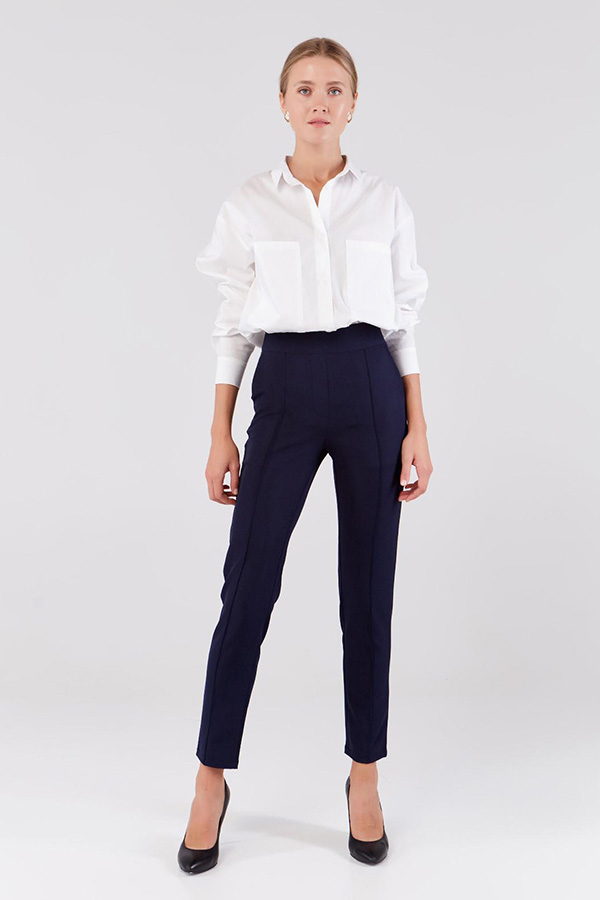 Используя принцип двух вертикальных линий, можно сделать фигуру визуально тоньше и длиннее. В этом помогут брюки со стрелками. А если хотите быть ещё стройнее, носите их с обувью на каблуках.