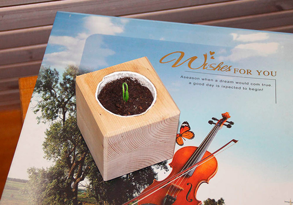 - Наполните горшочек в кубе землёй, оставив 1 см до верхнего края. Уплотните землю и высадите семена — чуть вдавите их.
