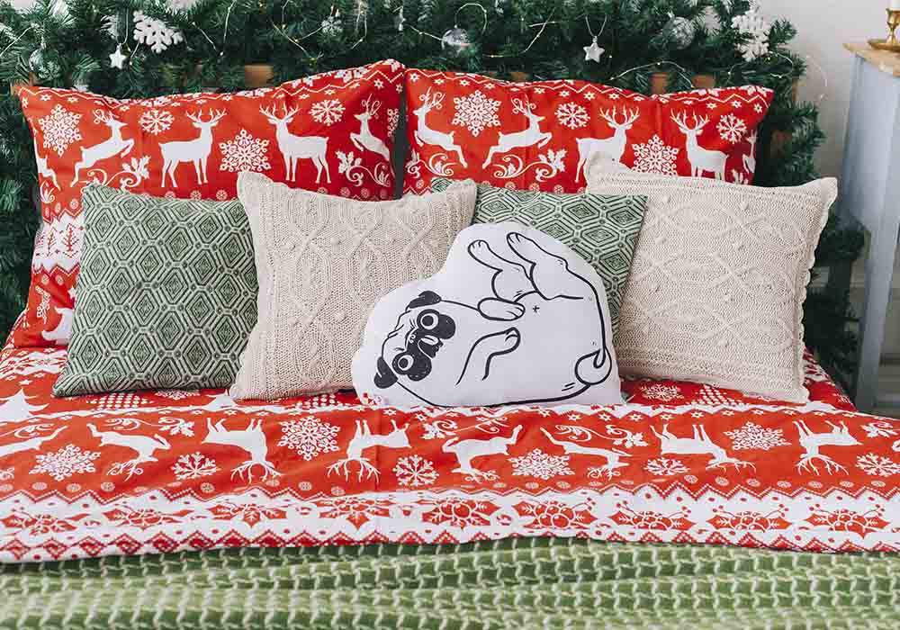 Декоративные подушки и наволочки с тематическим рисунком станут отличным дополнением к другим новогодним декорациям. Подберите пару ярких изделий для дивана или кровати, чтобы расставить акценты в интерьере.