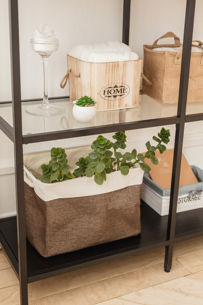 Жёсткие деревянные изделия отлично сочетаются с мягкими из джута. Попробуйте скомбинировать эти материалы — ванная будет смотреться интереснее. А если хочется ещё больше красоты, добавьте на полочки свечи пастельных оттенков или растения. Кстати, кашпо для них может послужить тоже корзинка.