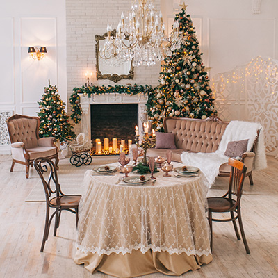 Держите наготове пару складных стульев для внезапных гостей, вдруг к вам на огонёк заглянет давний друг. Если гости пришли с детьми, организуйте для малышей отдельный стол. Для этого можно использовать небольшой журнальный. А чтобы не переживать, что дети испортят столешницу, накройте мебель яркой новогодней скарертью. А для каждого маленького гостя поставьте подставки под горячее.