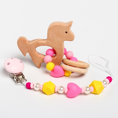 Появление зубов — болезненный процесс для малыша. Чтобы помочь крохе пережить этот период, дайте ему прорезыватель. Он сделан из экологически чистого материала и безопасен для ребёнка. Создатели дополнили прорезыватель держателем для соски. Изделие не даст пустышке упасть, а ещё имеет интересные разноцветные бусины — они развлекут малыша на прогулке.