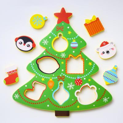 - Мозаика в виде фигурки дерева. В нём сделаны окошечки, которые малышу предстоит заполнить деталями, подходящими по форме.