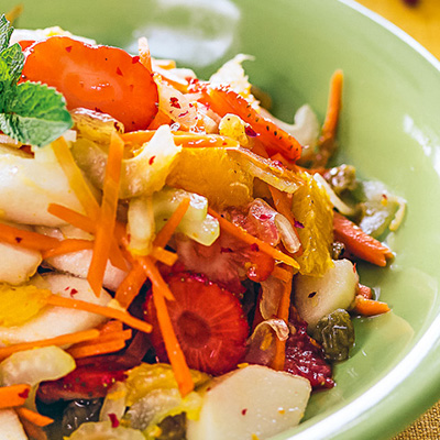- Уложите в миску все подготовленные продукты и добавьте изюм. Если попался сухой, предварительно запарьте его кипятком на 5–7 минут.