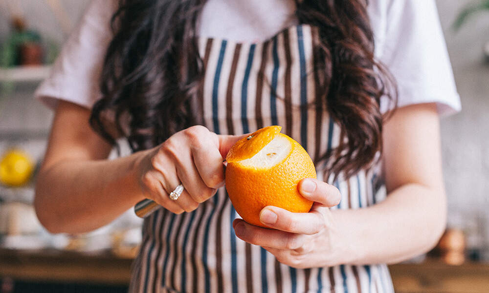 - Разделите апельсин на дольки и освободите каждую из них от белых прожилок с помощью ножа. Разделывайте фрукт над миской, чтобы собрать сок и использовать его для заливки салата.