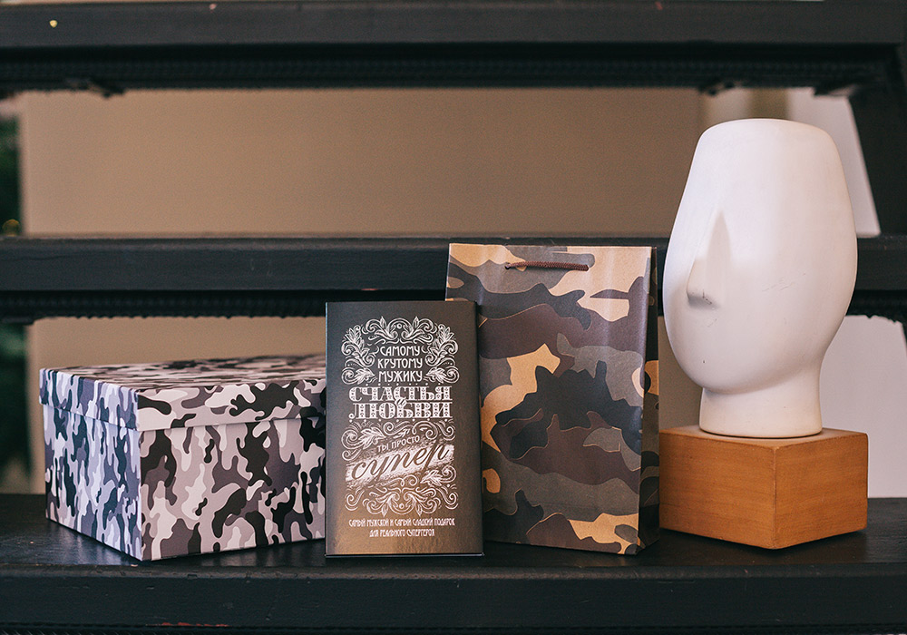 Вот где поистине царство брутальных принтов и расцветок! Традиции празднования Дня защитника Отечества диктуют нам свои правила. И даже для малышей средней группы детского сада родители выбирают тематическую упаковку со звёздами, камуфляжем или военной техникой.