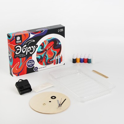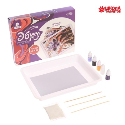 Для уникальной картины понадобятся лоток, холст, специальные краски и секретный ингредиент — он сделает воду вязкой и не даст пигментам раствориться в жидкости. Всё нужное уже собрано в наших наборах, так что можете начинать творить!