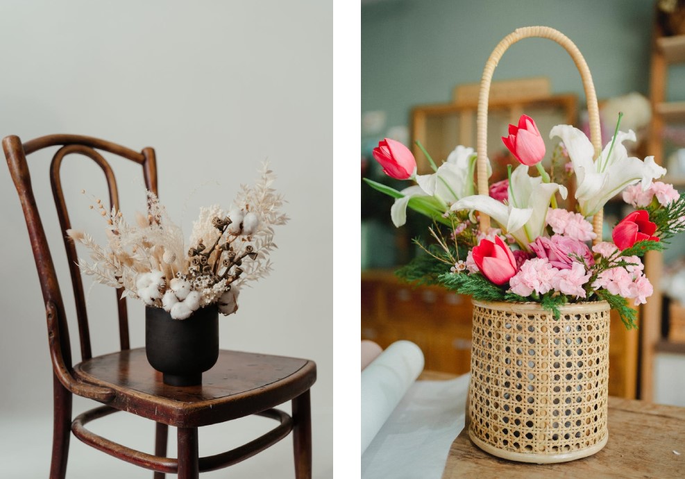 Если хочется чего-то более похожего на привычные цветы, попробуйте составить авторский букет. Используйте декоративные растения, которым не нужна вода, и оформите корзинку или кашпо. Вы получите интерьерное украшение, которое будет максимально похоже на живые цветы, но гораздо долговечнее.