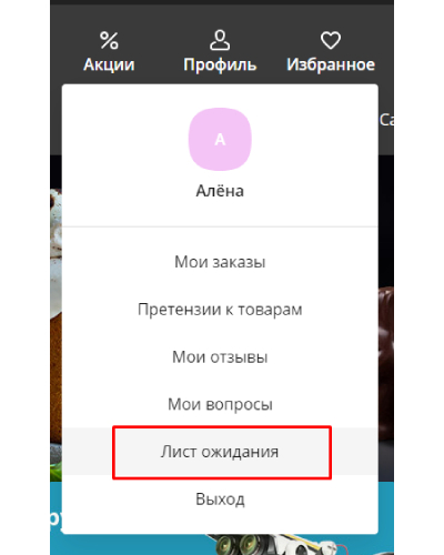 Списком ожидаемых товаров легко управлять в вашем профиле. Чтобы открыть перечень, зайдите в личный кабинет и нажмите на вкладку «Лист ожидания».