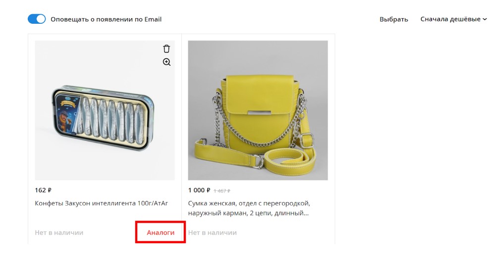 Пока ждёте товары, можете посмотреть их аналоги. Нажмите на одноимённую кнопку и увидите список альтернативных вариантов, которые легко заказать прямо сейчас.