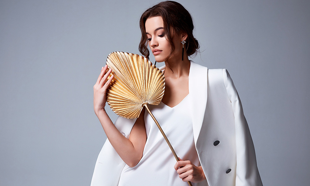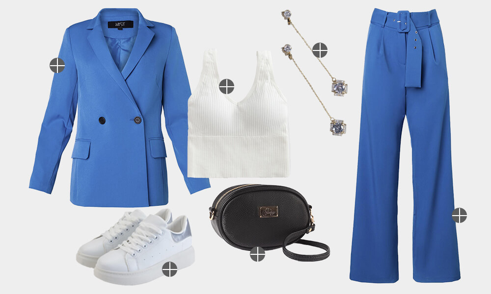 Если ваша выпускница любит ярко одеваться и выделяться из толпы, предложите ей выбрать костюм насыщенного синего оттенка. Добавить наряду благородства и глубины получится с помощью вещей белого цвета. А дополнить образ можно модной поясной сумкой и асимметричными серьгами.