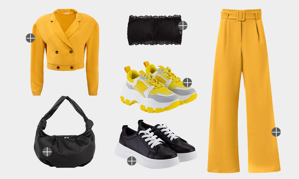 Этот цвет притягивает внимание и вносит в атмосферу жизнерадостность. А особенно фактурно и дорого будет смотреться модный оттенок Illuminating. Хорошим дополнением к образу станет трендовая чёрная сумка-багет и кеды на толстой подошве.