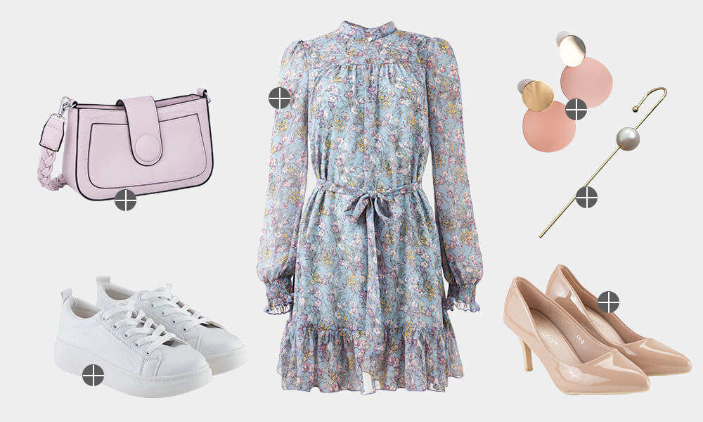 Платья голубых оттенков подходят девушкам любого цветотипа, без исключения. Главное, подобрать свой тон. Такое платье будет хорошо смотреться как с кедами, так и с туфлями-лодочками. Для образа с изящной обувью выбирайте нежные классические серьги, а с кедами наденьте хайповые каффы.