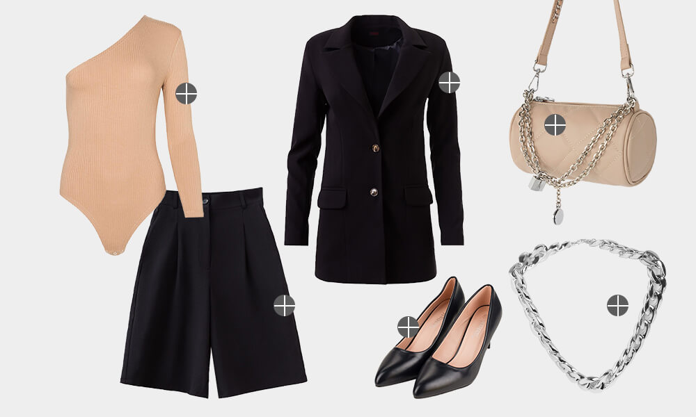 Хотите создать нежный образ — выбирайте одежду бежевого цвета. А чтобы сделать наряд эффектным, миксуйте телесный оттенок с чёрным. Для стильного образа подойдут шорты-бермуды, бежевое боди и туфли-лодочки. Завершить модный look можно толстой золотой цепью и сумкой с похожими мотивами — тогда образ получится гармоничным.