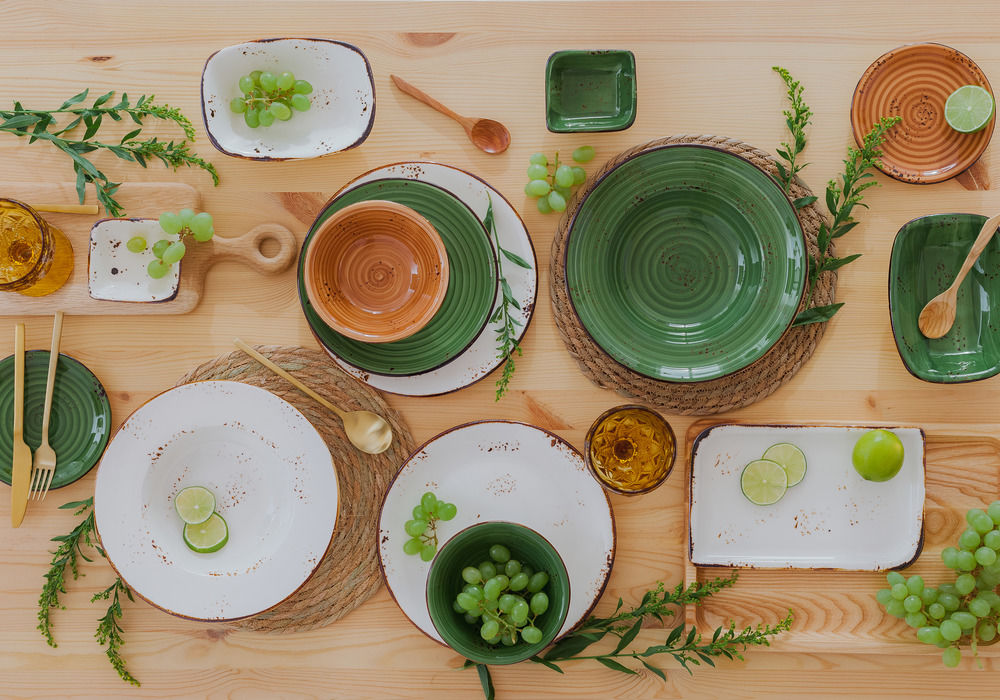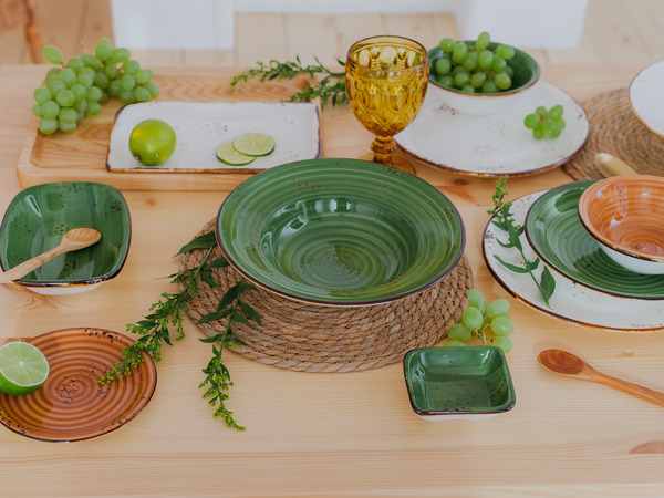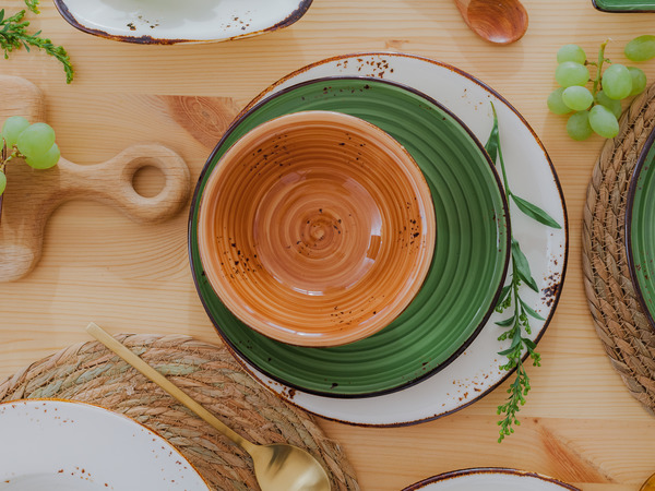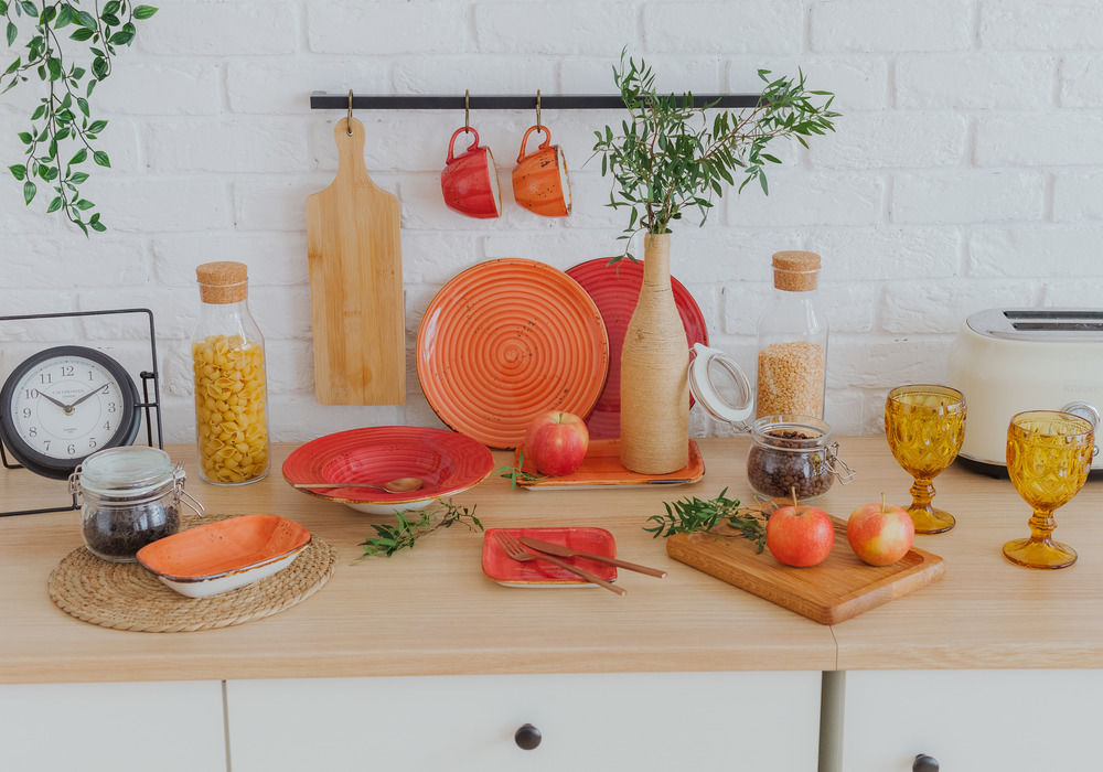 Если хотите оживить интерьер кухни, используйте посуду природных оттенков. Она безупречно сочетается с оформлением в экостиле, а ещё удачно смотрится на столешницах из массива и с деревянными подносами. Результат: гармония, свежесть и уют.