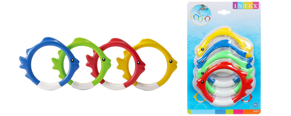 Объявите кольца сказочными сокровищами и предложите пловцу поиграть в водолаза. Пусть по очереди собирает снаряды и приносит