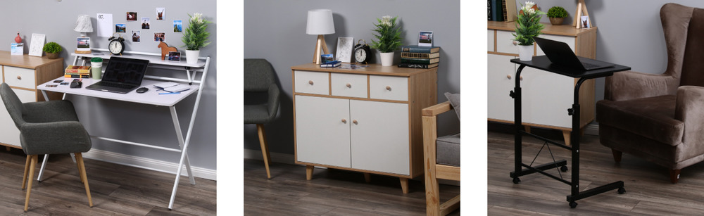 Сэкономить полезное пространство помогут и нестандартные дизайн-решения. Присмотритесь к складной мебели, столам с дополнительной зоной хранения и мобильным подставкам для ноутбука. Такие можно использовать по мере необходимости либо для нескольких функций одновременно.