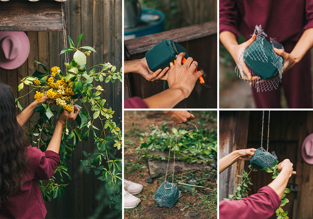 Сначала нужно заполнить объём и скрыть саму губку. Для этого лучше всего подойдёт зелень. Мы использовали веточки барбариса, винограда и листья хрена.