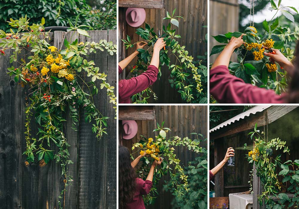 Если вы попробовали свои силы на букетах и вошли во вкус, предлагаем сделать необычную подвесную композицию. Ею можно украсить дверной проём, повесить над столовой зоной или на стену.