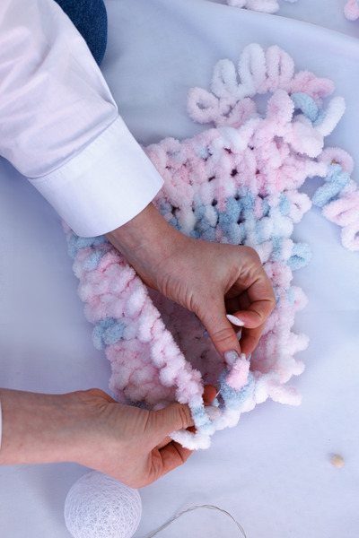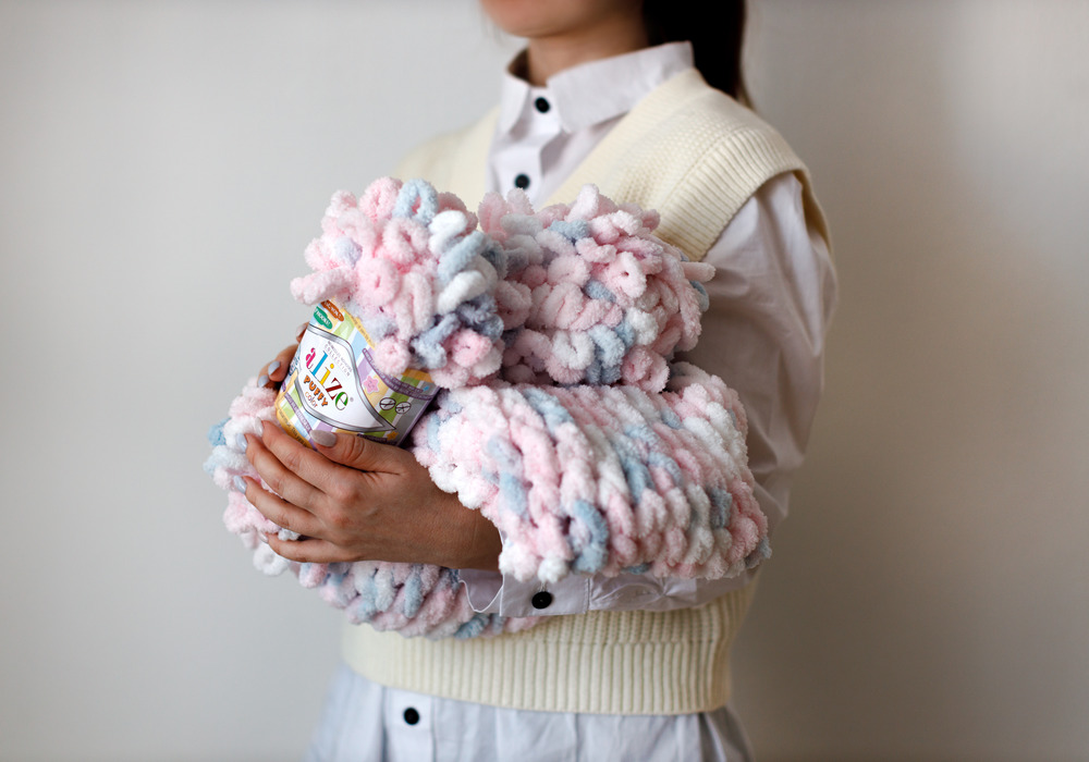 Вы можете использовать любые нити с готовыми петлями. Для мастер-класса мы взяли пряжу из микрополиэстера торговой марки ALIZE. Она гипоаллергенная, мягкая и лёгкая, с ней просто работать.
