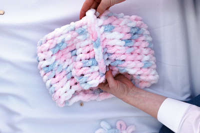 7. Чтобы соединить края изделия, поверните полотно лицевой стороной к себе. Хвостики должны оказаться внизу. В начале вязания (у первого ряда) есть отверстия, а в конце — петли. Проденьте петли в соответствующие им отверстия, а затем закройте.