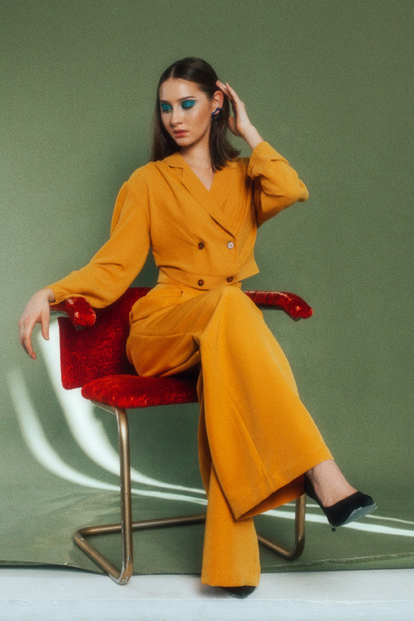 Детали. Простые линии, А-образные фасоны, жёсткие силуэты, обувь на платформе, брюки и брючные костюмы, приковывающие внимание аксессуары, яркий макияж, акцент на веки.