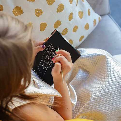 Гравюра — это изображение, спрятанное под слоем краски. Чтобы получить готовую картину, нужно стереть защитное покрытие по заданным линиям. Для этого в наборе есть специальный скребок — штихель.