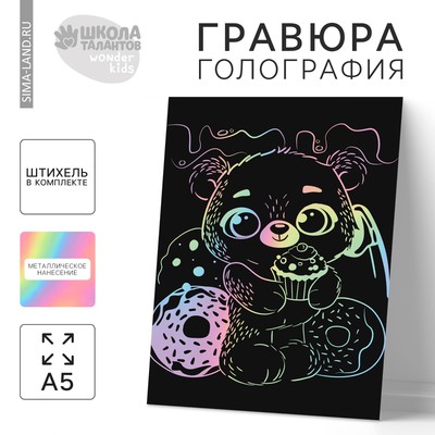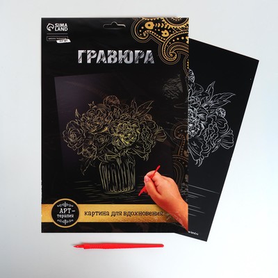 Гравюра — это изображение, спрятанное под слоем краски. Чтобы получить готовую картину, нужно стереть защитное покрытие по заданным линиям. Для этого в наборе есть специальный скребок — штихель.