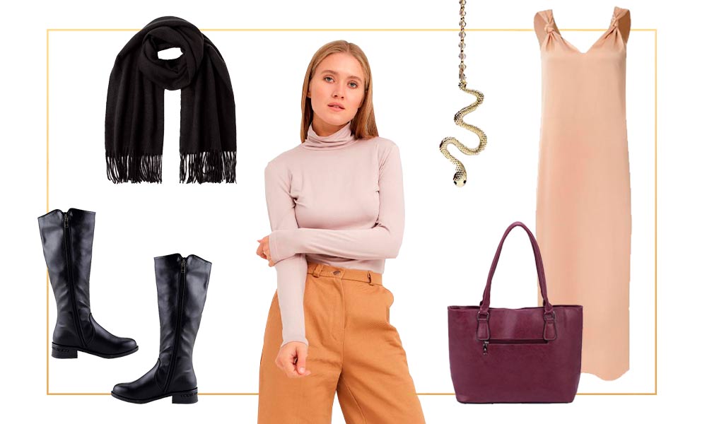 На фото — бежевая водолазка MINAKU: Basic line, золотистое платье MINAKU: Silk pleasure, чёрные сапоги Qiya, бордовая сумка-тоут, чёрный палантин MINAKU, чёрная цепь в золоте Meitesi.