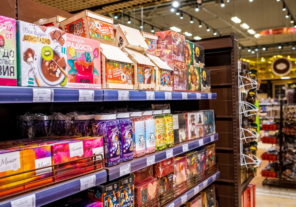 Покупатели предпочитают упорядоченные витрины. Старайтесь сделать выкладку правильной: аккуратной и с устойчивой композицией, где нет хаотично расставленных изделий. Чёткие ряды, вертикальные линии и одинаковое расстояние между товарами и стеллажами — то, что нужно для комфорта клиентов и вашей прибыли.