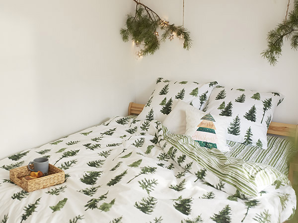 Любители экологичных материалов по достоинству оценят светлую гамму и принты с элементами природы. Этот текстиль придаст праздничный антураж и создаст атмосферу волшебной лёгкости в вашей спальне.
