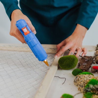 Стол лучше чем-нибудь накрыть, чтобы не испачкать клеем, а пол под ним удобно застелить полиэтиленовой плёнкой. С камешков и мха могут опадать ворсинки, и плёнка спасёт вас от лишней уборки.