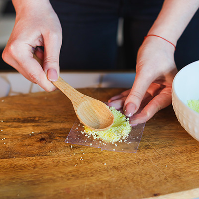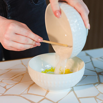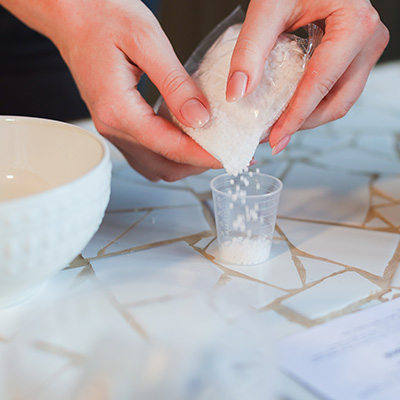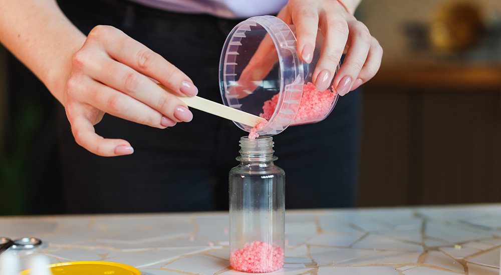 Отсыпьте основу в виде белых жемчужинок в подготовленную ёмкость.