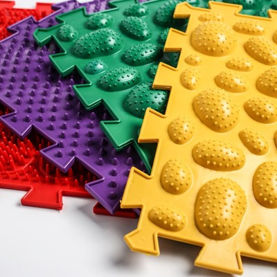 Пазлы представляют собой рельефные модули, которые скрепляют в единое полотно. Благодаря разной фактуре и степени жёсткости деталей, они оказывают массажный эффект. Изделия улучшают циркуляцию крови в ногах, тренируют связочный аппарат и помогают правильно сформировать своды стоп. Если заниматься регулярно, можно не переживать, что с ножками возникнут проблемы.
