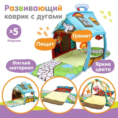 Если вам нужно немного свободного времени, просто положите ребёнка на коврик — он будет наблюдать за предметами на дугах. Но для бо́льшей пользы поиграйте вместе с малышом. Например, изучите с ним части тела: показывайте их сначала на игрушках, а потом у малыша. Также можно запомнить цвета, формы, названия животных.