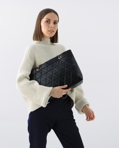 Этот шопер относится к той категории аксессуаров, которые называют беспроигрышными. Универсальный чёрный оттенок, модная стёжка и вместительный объём позволяют представить сумку как на деловой встрече, так и на пикнике с подругами.
