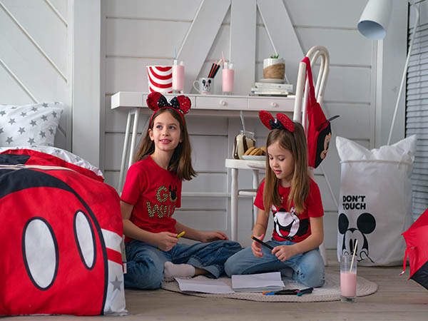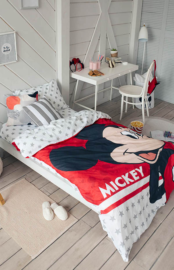 Для оформления комнаты в стиле самого популярного диснеевского мышонка вам понадобится: постельное бельё с красочным принтом, гирлянды, подушки и другой тематический декор. Поддержать мультяшную атмосферу можно футболками с Микки и ободками с ушками.